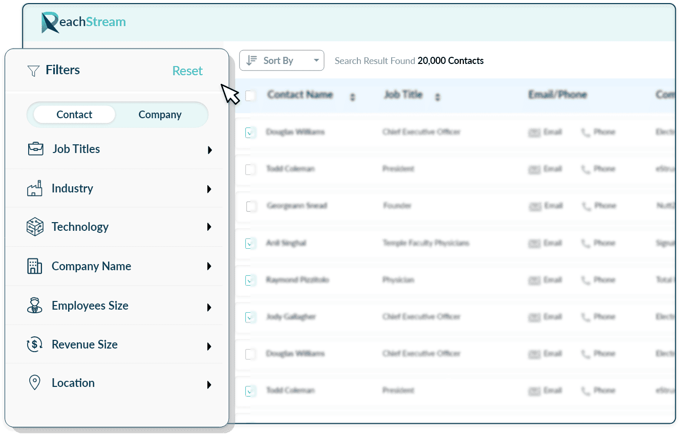 Sign in to ReachStream. Select your search criteria using the contact and company filters on the left filter panel.