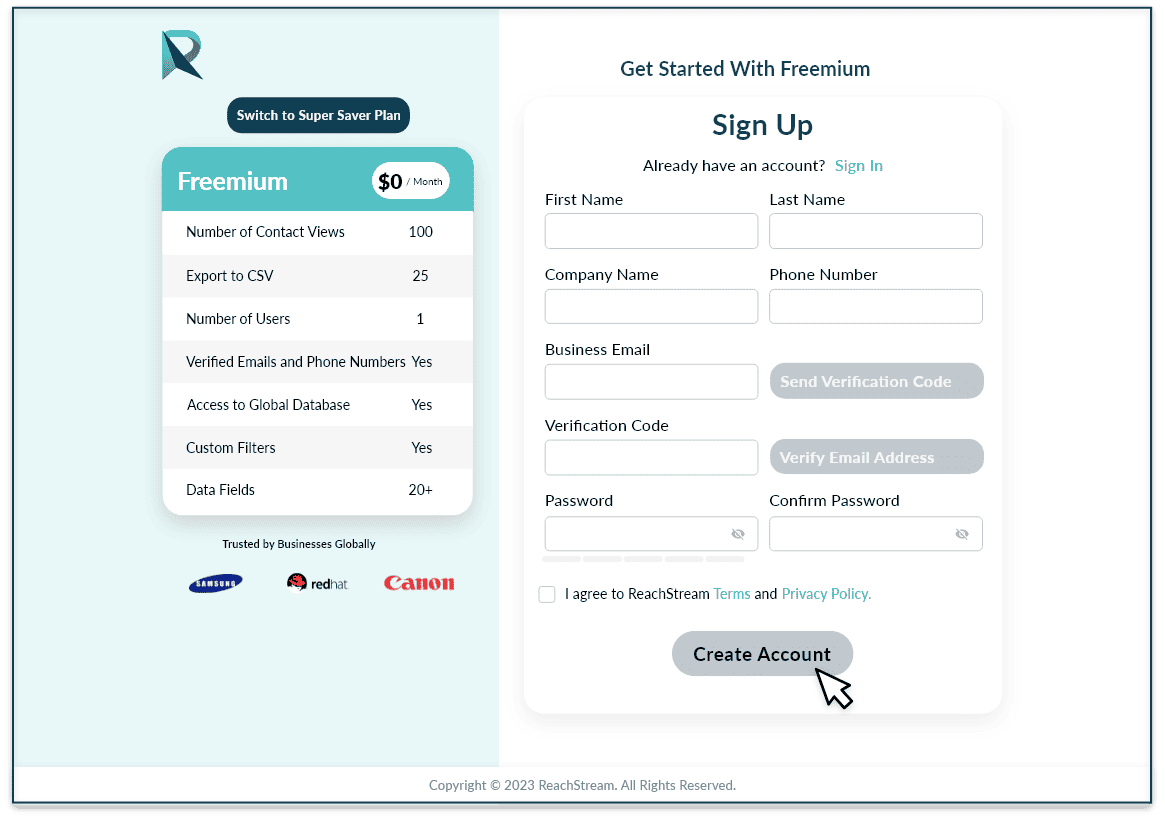 ReachStream Freemium lets you view 100 profiles and download 25 leads every month. You can request additional credits (downloads) with your custom data requirement or get advanced API access.