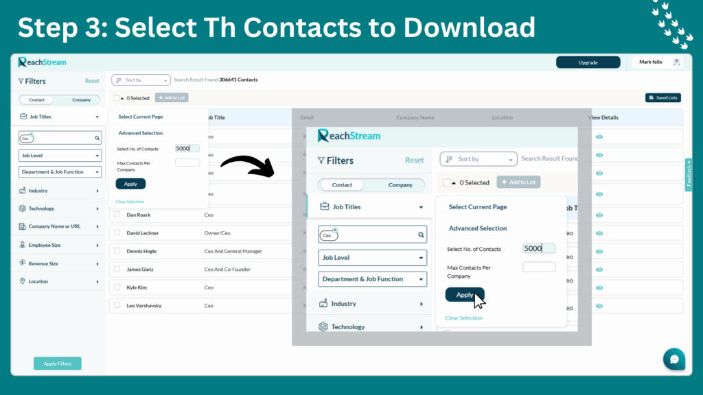 Choose the exact number of records you need for your campaign. Whether you’re targeting a small group of startup CEOs or building a robust List of Company CEO Email Addresses for enterprise outreach, ReachStream allows full control over your exports.