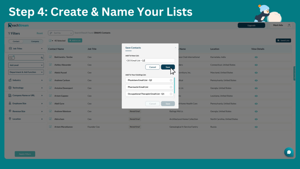 To stay organized, you can name and categorize your lists based on target segments or campaign timelines. For example, “Chief Executive Officers Mailing List – Q3 Enterprise Focus” or “List of US-Based CEO Email Addresses – Tech Startups.”