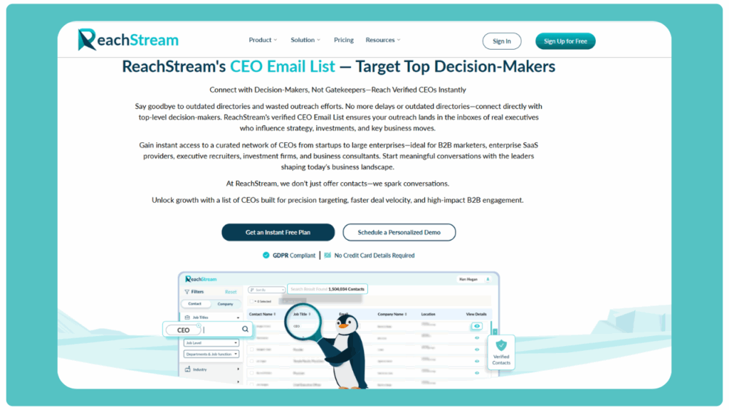 Start by signing up and logging into the ReachStream platform. The free Icebreaker plan gives you immediate access to thousands of verified contacts from their global CEO Email Directory, including a rich base of USA CEO Email Addresses.